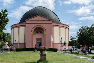Die in Darmstadt recht häufig vorkommenden Ludwigs hatte ich ja schon im zweiten Teil erwähnt und selbstverständlich gibt es auch eine Kirche mit diesem Namen, die katholische Innenstadtkirche St. Ludwig, im Volksmund Kääsglock genannt. Dort musste sich der Pappenheimer vor ungefähr 60 Jahren unter seltsamen Beschwörungsformeln Wasser über den Kopf gießen lassen, damit er später ordentlich Kirchensteuern bezahlen kann. Wegen dieser fast tragischen Geschichte sind wir allerdings nicht hier, wir wollen das fotografieren. Als Vorbild für den klassizistischen Bau diente nämlich das Pantheon in Rom und da wir beide nicht mehr nach Rom kommen werden, toben wir uns halt fotografisch an der Darmstädter Miniaturausgabe aus.